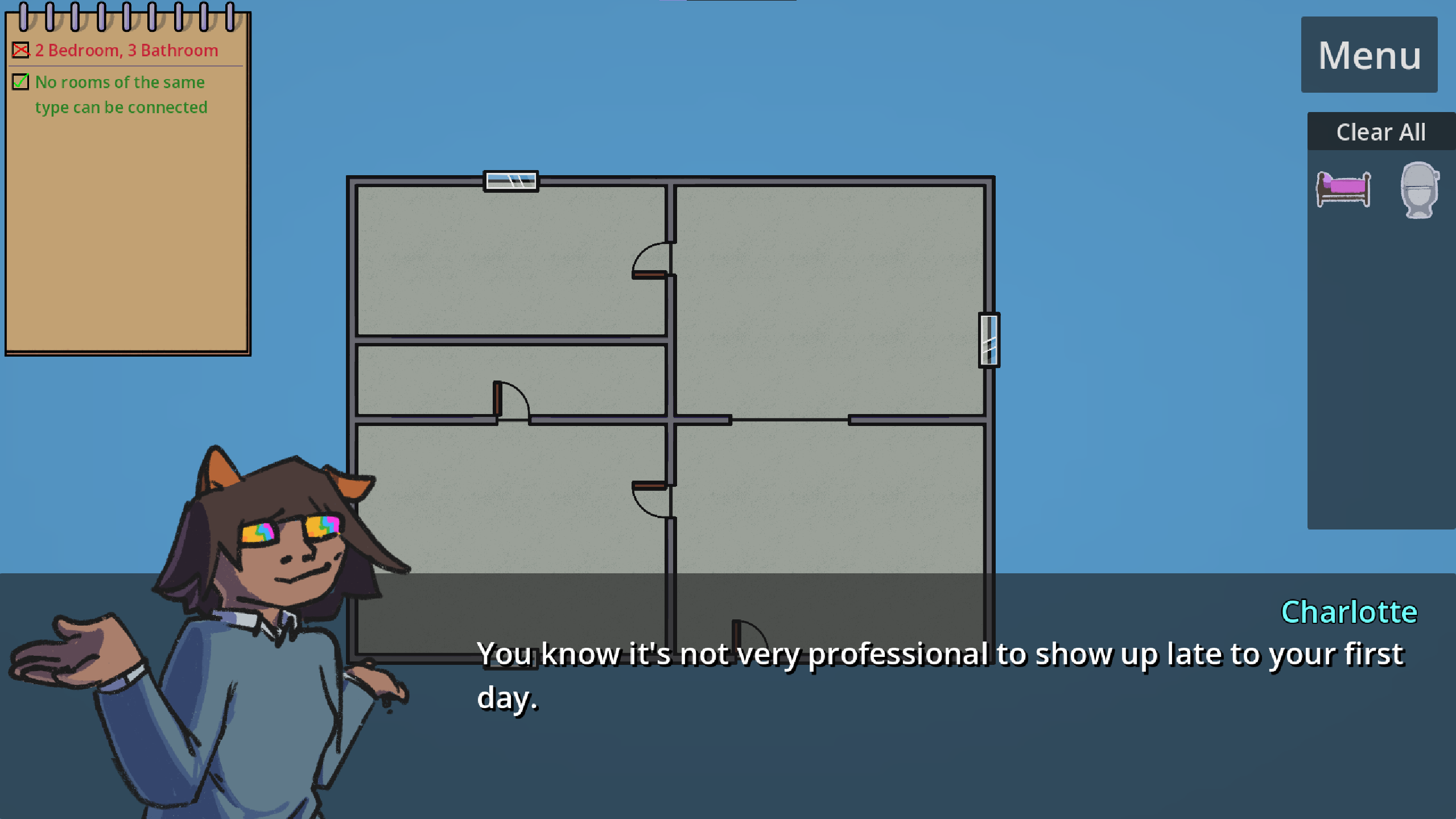 The game overall feels like such a complete package. The music, writing, and art were so charming (shoutout to the Charlotte thumbs up sprite <3) and genuinely very funny. I laughed so many times. I wish I could play a full game in this world with these silly characters.